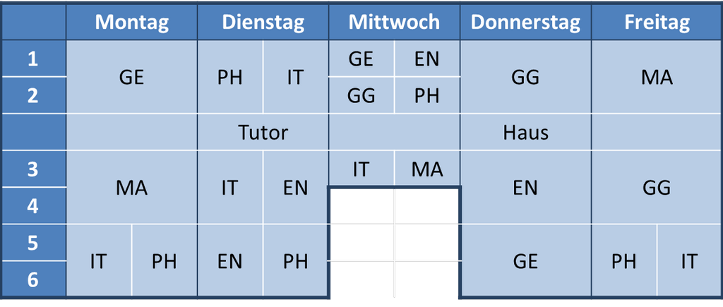 Mittwochs ist ein entspannter Tag: Hier wurden die Doppelstunden durch normale Einzelstunden ersetzt. Aber trotzdem nur drei!