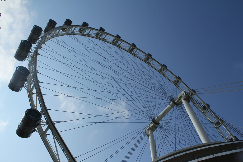 Unsere erste Station: Der Singapore Flyer, das größte Riesenrad der Welt. Direkt an der Formel-1-Strecke gelegen ist es eines der Wahrzeichen Singapurs. Donnerstagmorgens ist wenig Betrieb, ohne Wartezeit besteigen wir also eine der 28 Kabinen und lassen uns die nächste halbe Stunde langsam aber kontinuierlich ein Mal in der Runde drehen. 165 Meter über der Erde schwebend bietet sich eine grandiose Aussicht: