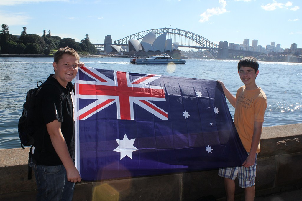 Von unserem Picknickplatz ergibt sich auch noch einmal ein wunderbarer Blick auf Sydneys Wahrzeichen-Ensemble und so posieren Nicolas und ich mit der australischen Flagge (ja, ich habe an alles gedacht!